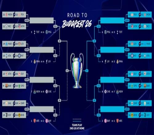 按照第7轮结束后的排名,欧冠淘汰赛对阵情况如下